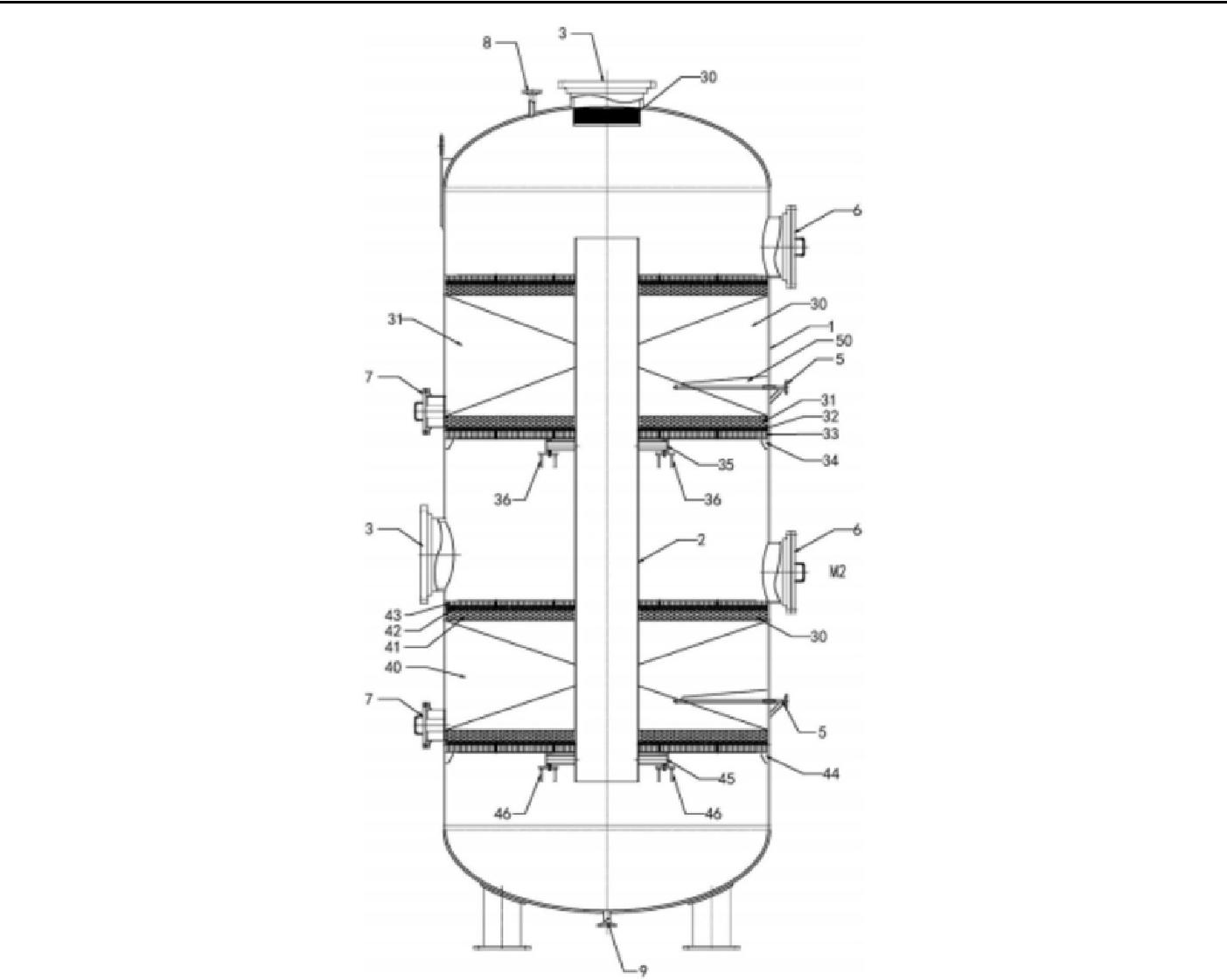 硝酸尾氣中氮氧化物的氮氧化物(NOx)主要由一氧化氮(NO)和二氧化氮(NO2)組成,NOx的處理主要是以氨做還原劑在催化劑的作用下將尾氣中的NOx選擇性還原為N2和H2O,達到脫除NOx的目的。由于硝酸尾氣排放量大,壓力大,不能達到使尾氣與氨在還原劑的作用下充分接觸,而降低轉化效率,因此目前需要一種能滿足要求能夠使尾氣與氨在還原劑的作用下充分接觸達到有效處理尾氣中氮氧化物的目的