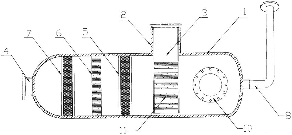 分離裝置主體1、葉片式進料分布器3和弧形導流葉片11由鋁合金材料或不銹鋼材料或鑄鋼材料制成,鋁合金材料、不銹鋼材料和鑄鋼材料結構堅固、耐磨性好,可以令本發(fā)明獲得持久的使用壽命。設置一個密封罐體作為分離裝置主體1,在分離裝置主體中部垂直導通連接一個帶液氣體進口2,在分離裝置主體1的兩端分別導通連接氣體出口4和液體導出管8,帶液氣體進口2中嵌合安裝一個葉片式進料分布器3使得原料液體進液平穩(wěn)均勻分布,在葉片式進料分布器3至氣體出口4之間依次間隔安裝有金屬絲網除沫器5、葉片除沫器6和復合材料絲網除沫器7,金屬絲網除沫器5、葉片除沫器6和復合材料絲網除沫器7依次遞進對原料中含有的水汽進行分解并消除泡沫,平穩(wěn)均勻的進行送料,提高了反應的精確性和穩(wěn)定性,此外本發(fā)明通過優(yōu)化設計,可以最大程度實現氣液分離,相對其他氣液分離器具有結構簡單、體積小、效率高的優(yōu)點,因此具有很好的實用價值。